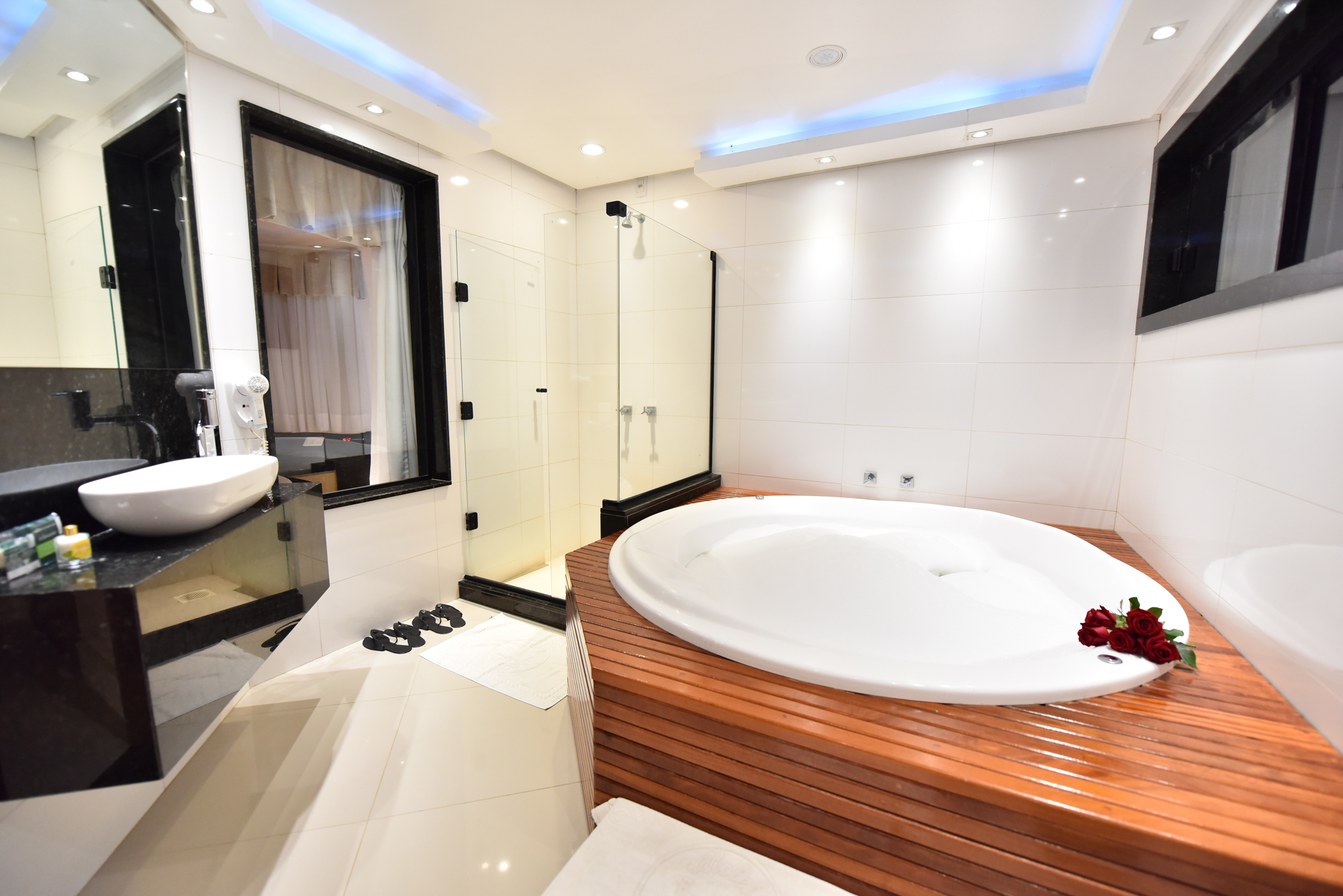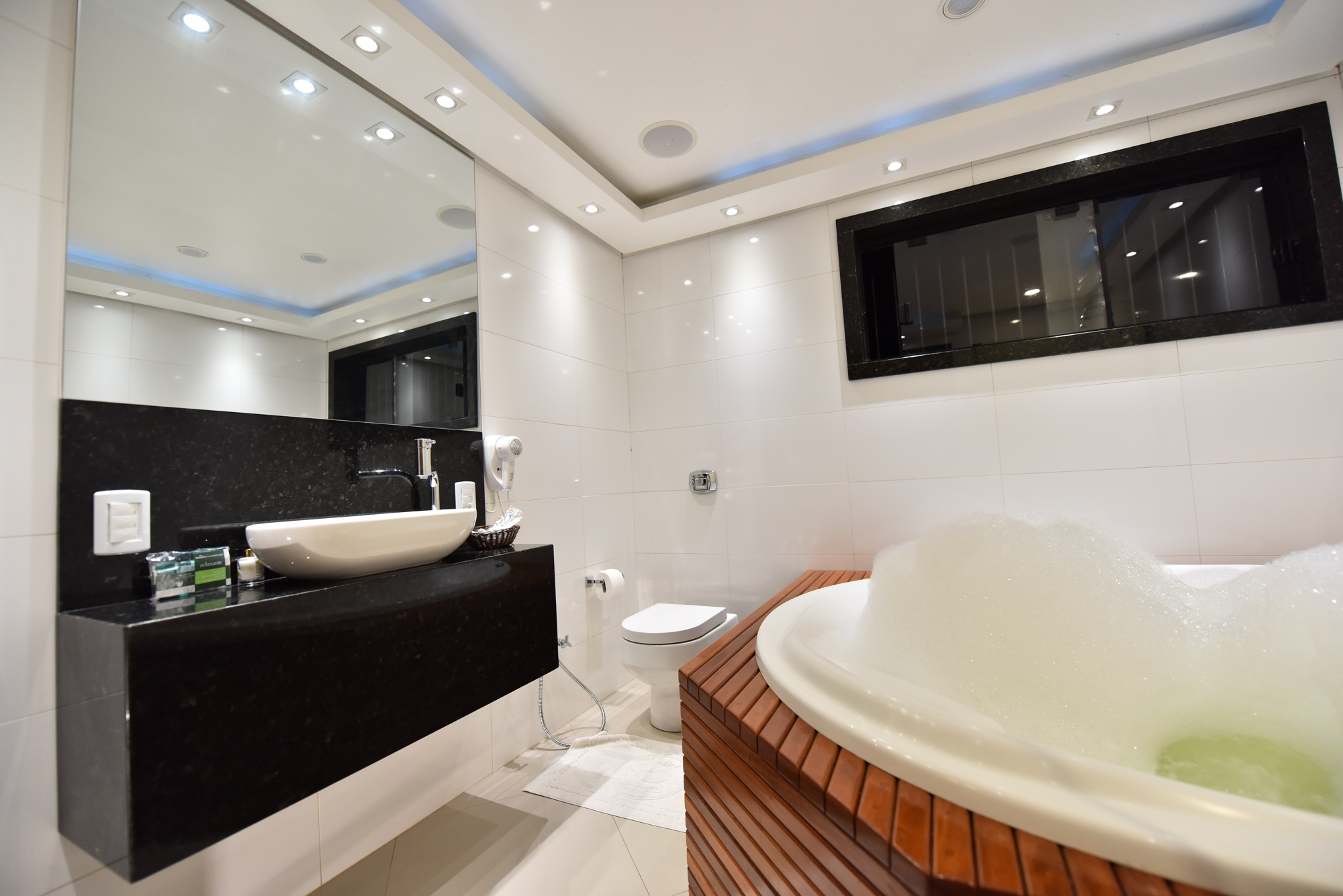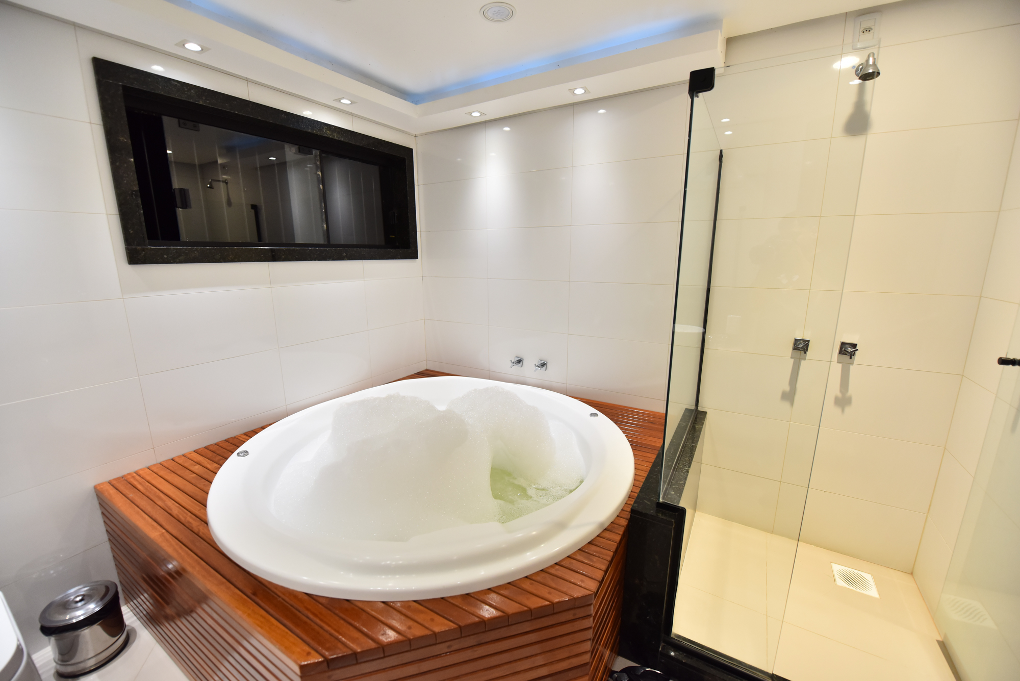 • Banheira de hidromassagem redonda com deck em madeira (1,8m de diâmetro)