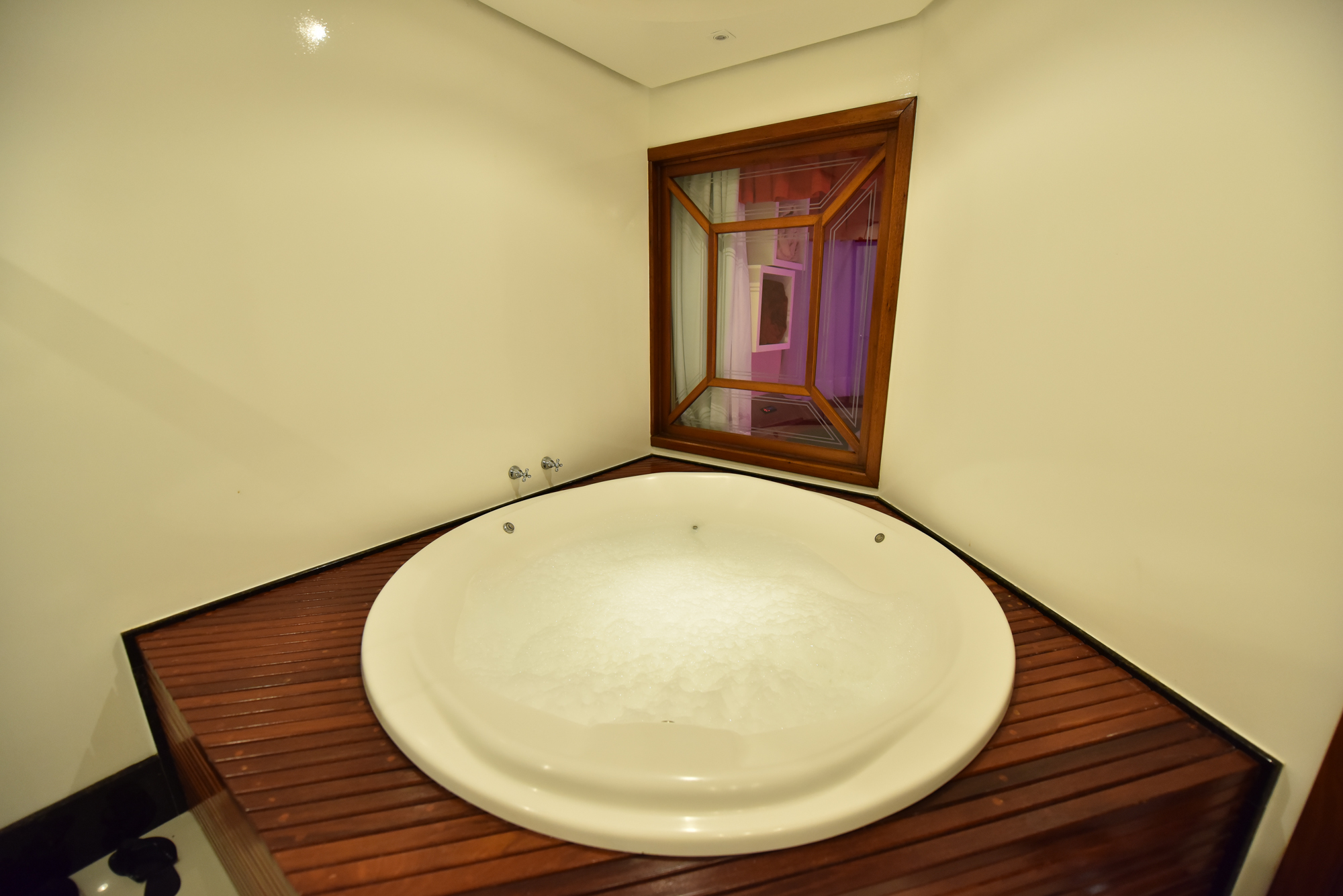 • Banheira de hidromassagem redonda com deck em madeira (1,8m de diâmetro)